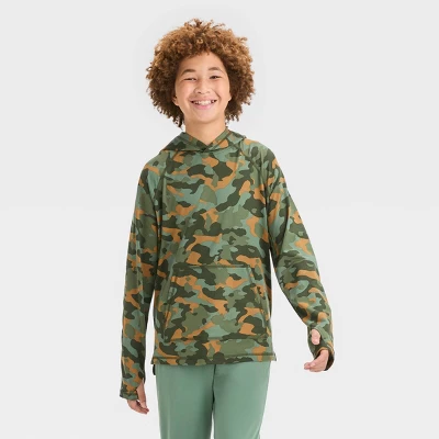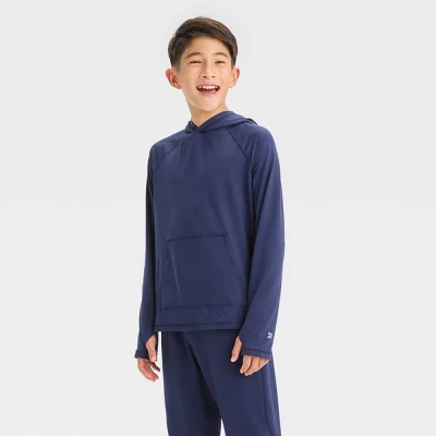 Long-sleeve pullover hoodie is made of a soft, stretchy midweight fabric with moisture-wicking and quick-drying properties to keep your child dry, comfortable and warm during any activity. The UPF 50+ rating provides protection against sun exposure. The attached hood keeps their head covered, and the long raglan sleeves with thumbhole cuffs lend enhanced warmth. A front kangaroo pocket completes the design with functional flair.