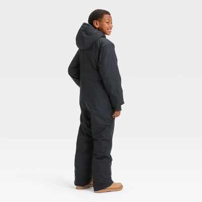 Black snow bib made from recycled polyester fabric with taffeta lining and comfy filling to keep your child warm and cozy during wintertime activities. Long sleeves with fleece thumbhole cuffs and attached hood help keep their arms and head cozily covered. Front zipper closure allows for easy on and off. Flap chest pockets and side slash pockets complete the design with functional flair.