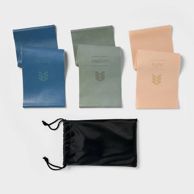 Loop band kit offering resistance for different types of workouts, stretching, strength training and more. Made from latex material for stretch. Includes three bands in various solid colors, offering light, medium and heavy resistance for squats, leg lifts and lunges.