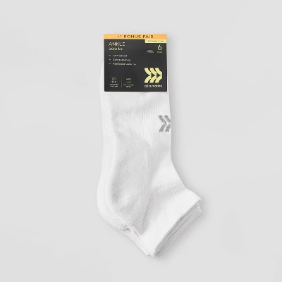 Six + one bonus pair pack of white athletic socks made from a moisture-wicking, midweight fabric blend with ventilating mesh helps keep your feet cool, comfy and dry. Arch support, reinforced heel and toe, Y-heel stitching and zone cushioning round out the comfortable fit. Plus, the ankle-cut design and white color add a touch of sporty style to your feet with any shoe.
