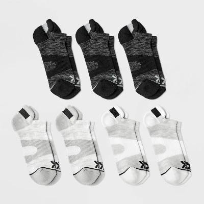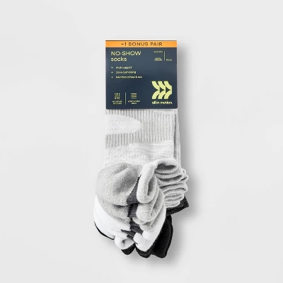 Six + one bonus pair pack of active socks, including three pairs in black and gray, and four pairs in white and gray. Made from a moisture-wicking, midweight recycled polyester blend with spandex as well as ventilating mesh to help keep your feet cool, comfy and dry. Heel tabs, arch support, reinforced heel and toe, and zone cushioning round out the comfortable fit. Plus, the no-show style makes them easy to wear with a variety of shoes.