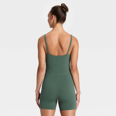 Everyday short bodysuit designed with a V-neckline and knee length. Made of midweight nylon-blend interlock fabric with added spandex for flexible wear. Boasts moisture-wicking and quick-drying properties to help keep you nice and cool. Built-in shorts offers added coverage to complete the sporty design.