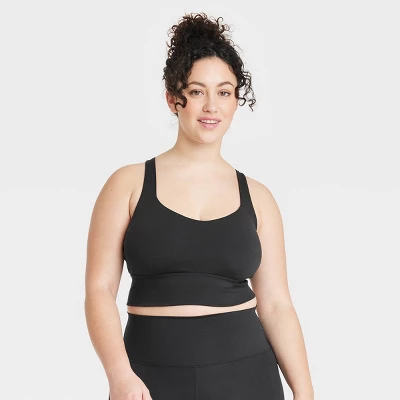 Solid-color longline sports bra with a crisscross strappy back. Provides light support suitable for lower-intensity workouts. Soft, stretchy fabric with quick-drying, moisture-wicking technology and mesh liner help keep you dry and cool while exercising. UPF 50+ rating adds extra protection during outdoor workouts, and you can adjust the coverage to your liking with the molded, removable cups.